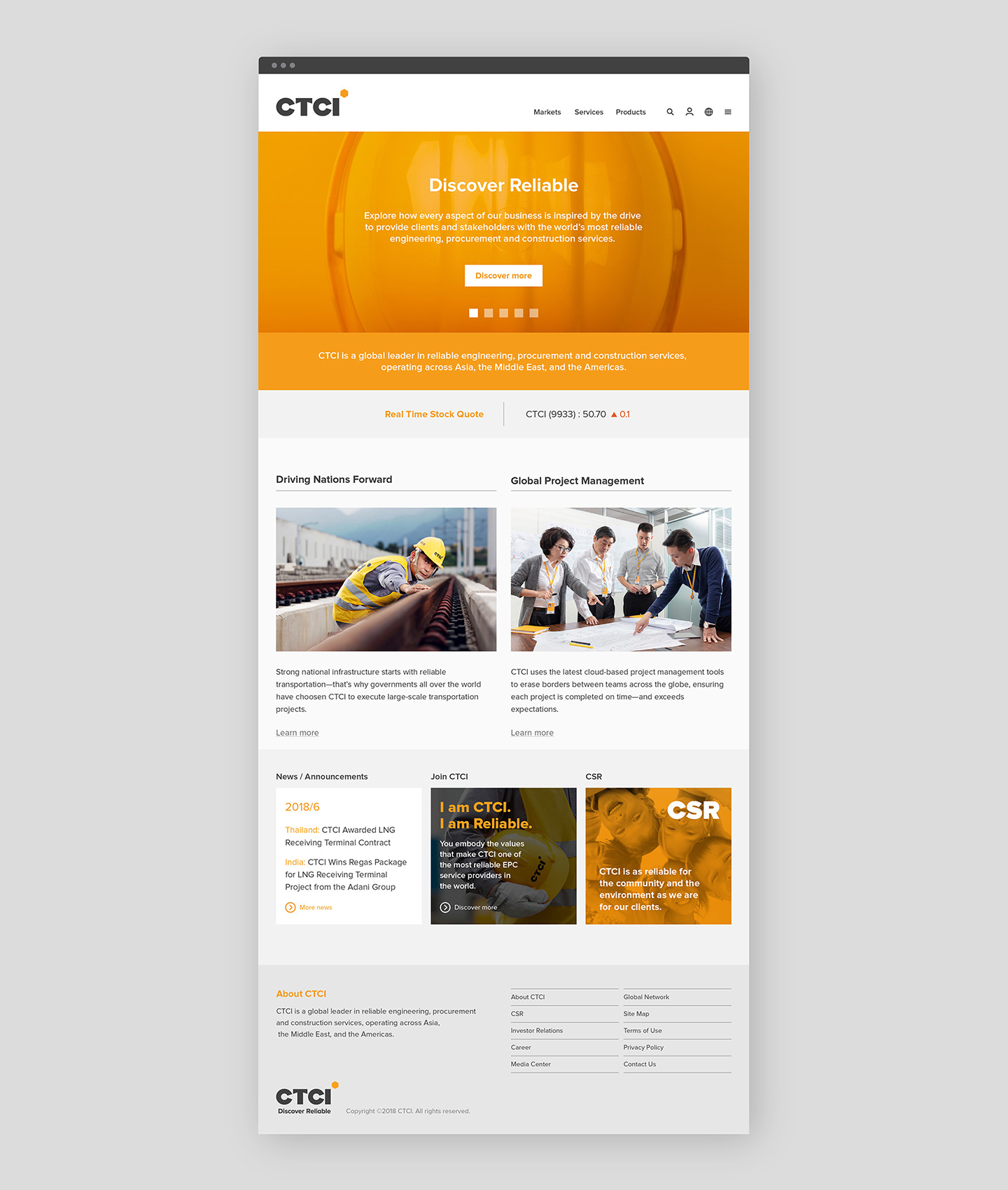 CTCI has extensive experience performing massive projects with outstanding safety, efficiency, and professionalism—our mission was to find the best message to convey this. We needed a core idea that would ring true for all subsidiaries and could transform an impressive company into a powerful brand. We found a distinctive quality that remained profoundly practiced by CTCI and inspired the core communication theme. The Discover Reliable message was created to welcome partners and clients to experience the difference when collaborating with CTCI while encouraging employees to uphold the promise of being the most reliable engineering provider.
