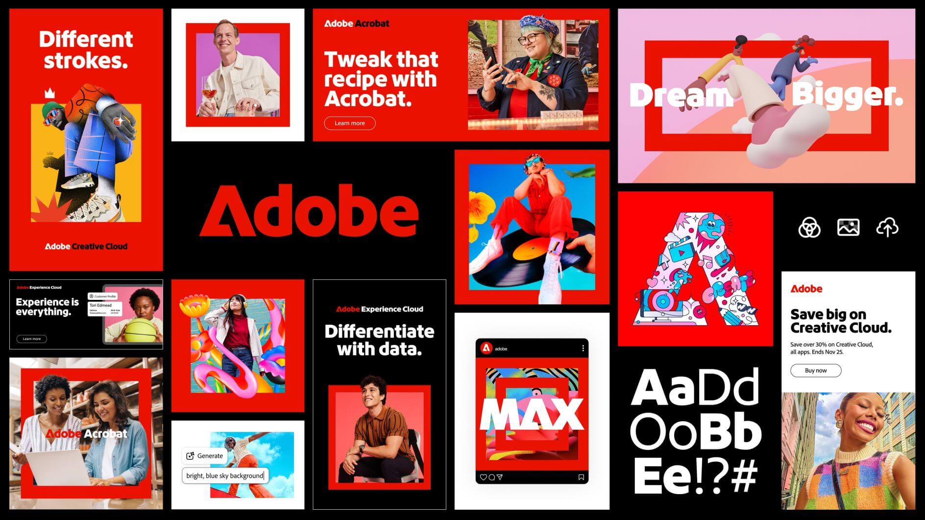 這個紅色框架,同時是一種視覺語言,也是一種品牌態度:它讓 Adobe 在各種產品、功能與使用情境中,保持清楚的辨識度,卻不干擾創作者本身的內容。