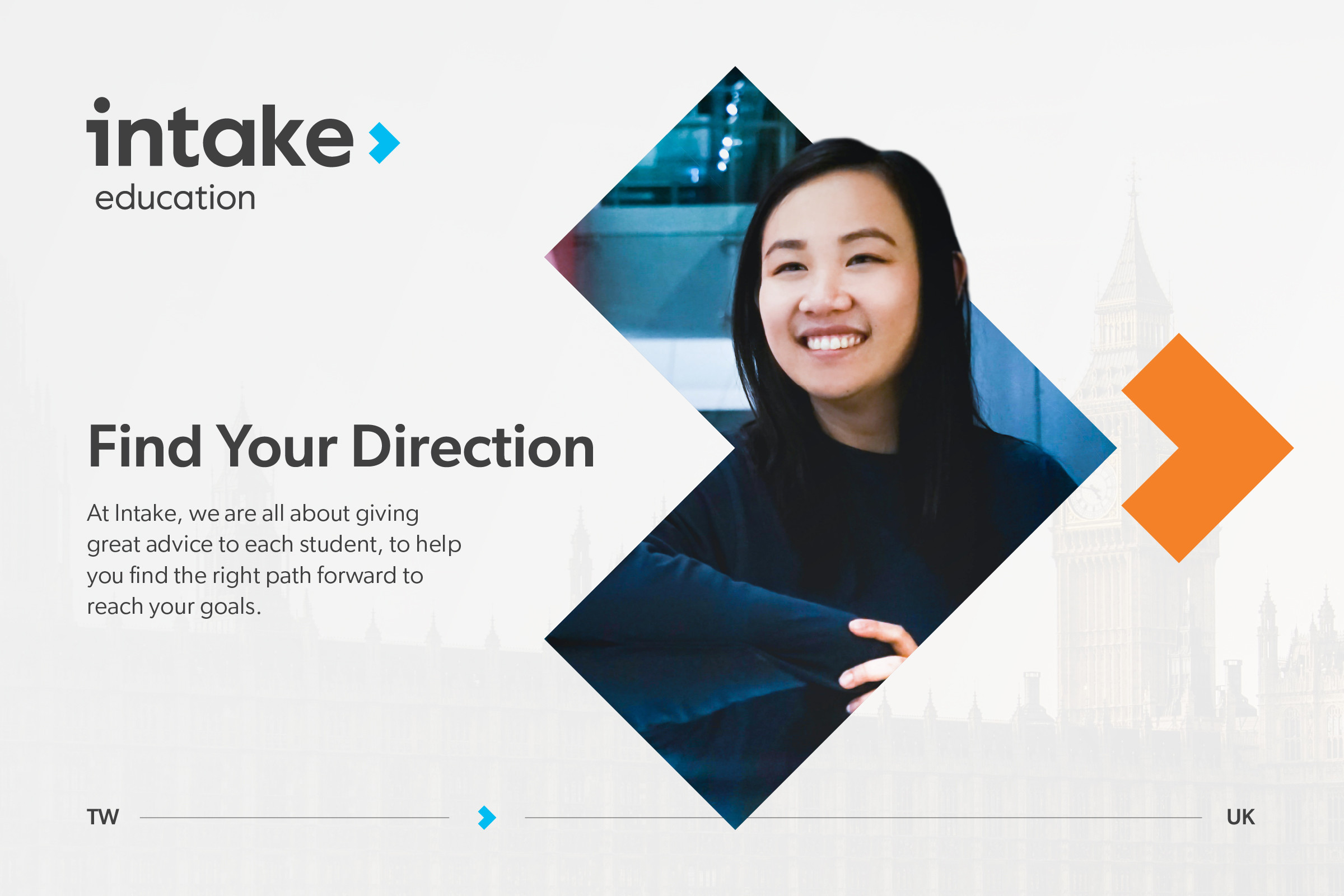品牌現有名稱「UKEAS」,直覺讓人產生地域的聯想,限縮了拓展新市場的機會。DDG 協助重新命名,將品牌名稱策略性的改為「Intake」(被錄取的學生之意),而這個名字也體現出在學生入學過程中,諮詢顧問團隊扮演著重要角色。