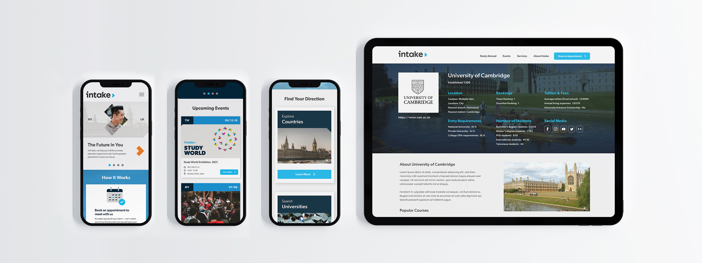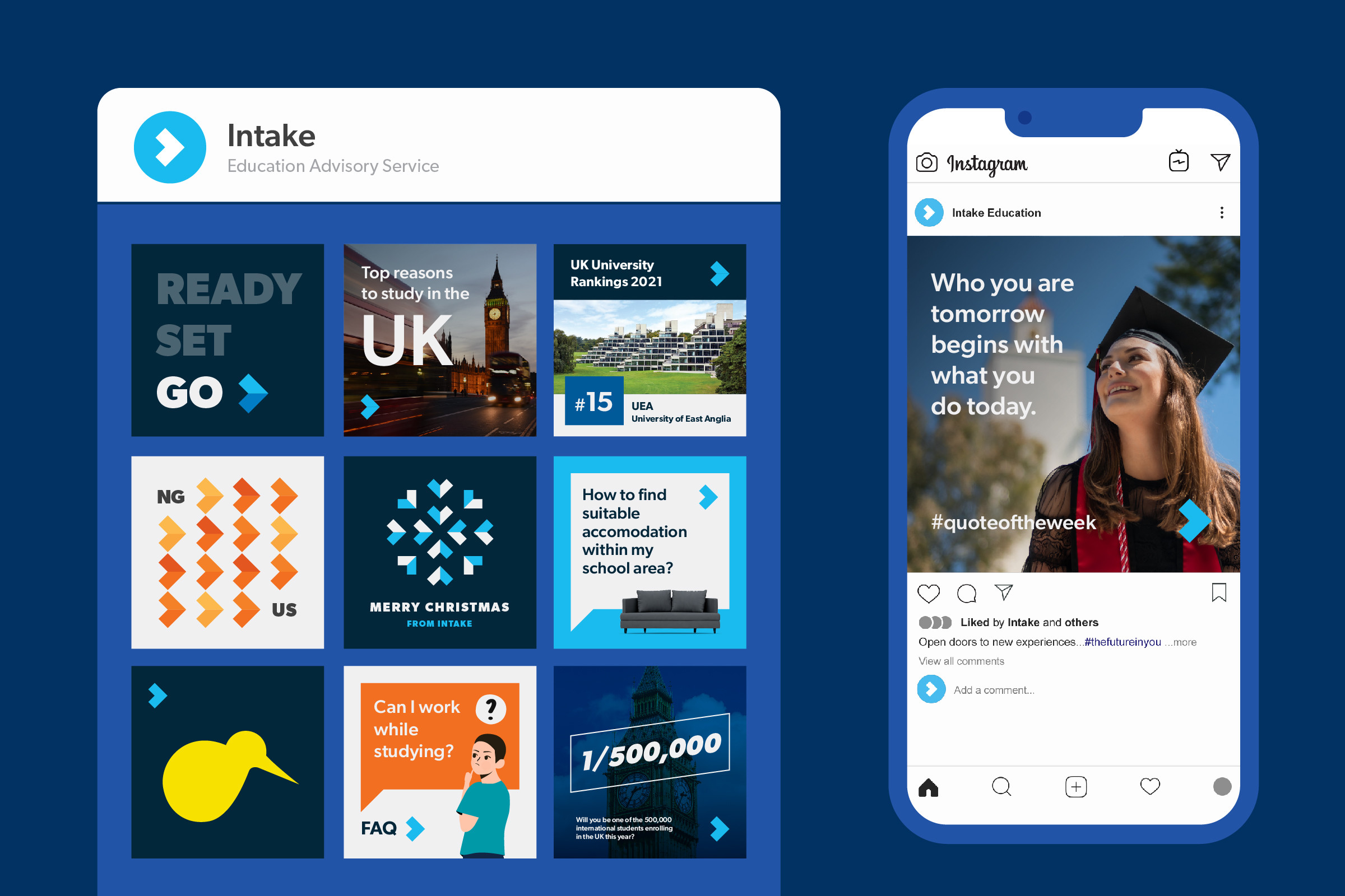 以學生為中心的品牌標語「The Future In You」,突顯 Intake 顧問團在諮詢背後所代表的深遠意義,加深學生對於留學計畫與自身未來的連結。重新定義的品牌訊息和語調,讓 Intake 即使在不同的國家,都能執行具有連貫性、靈活且富有創意的品牌行銷溝通。